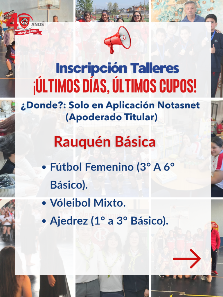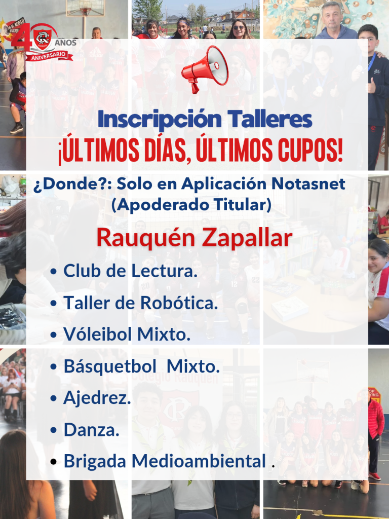 Recordamos a los apoderados que el único requisito para que sus hijos puedan asistir a los talleres extraprogramáticos, es que estén inscritos en la disciplina de su elección en la plataforma Notasnet.
