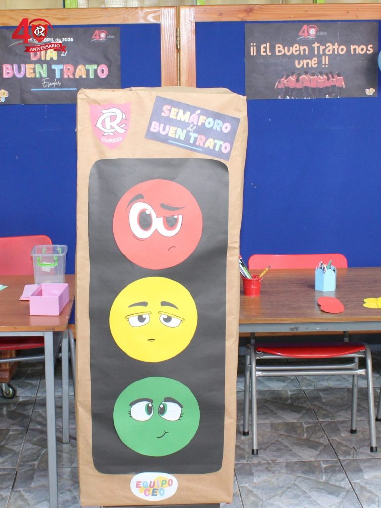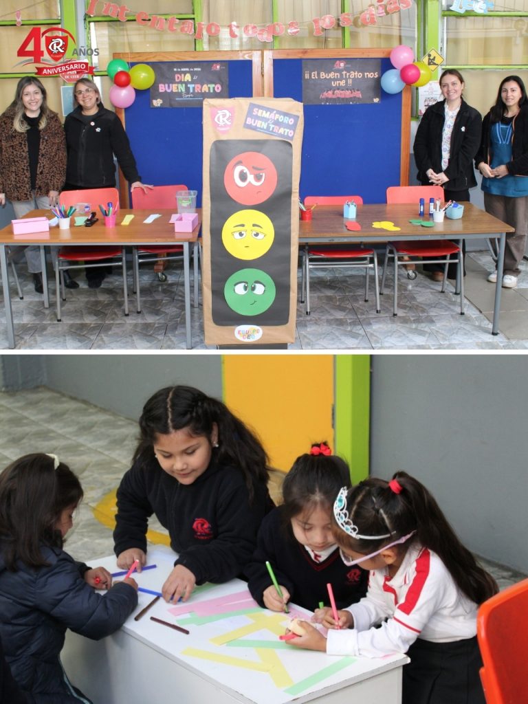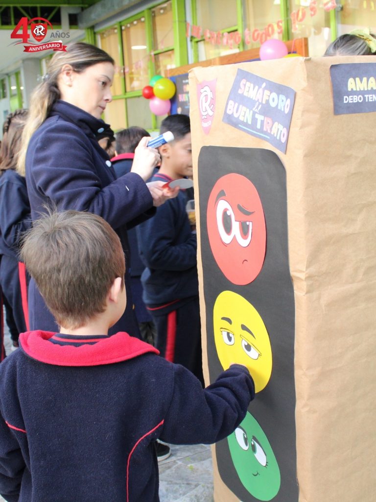 Durante los recreos, las niñas y niños participaron con mucho entusiasmo en dos entretenidas iniciativas: escribieron sus propuestas para mejorar la forma en que nos relacionamos, que fueron utilizadas para crear guirnaldas de colores bajo el lema “El buen trato nos une”. En la segunda actividad, las y los alumnos completaron círculos rojos, amarillos y verdes en los que también escribieron qué conductas consideraban negativas , de riesgo y positivas. Y pegaron estos círculos en el semáforo del buen trato.