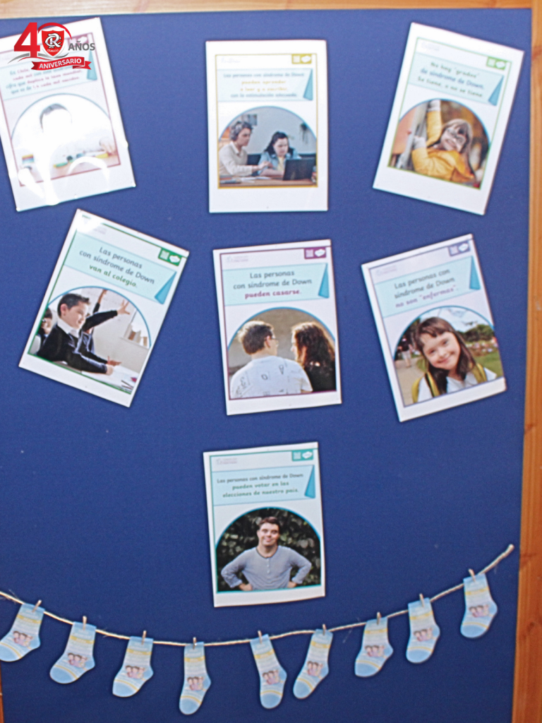 Además, con plumones, marcadores y hojas que dejamos a disposición de las y los estudiantes, escribieron mensajes sobre la inclusión, el respeto y la aceptación, mientras otros decoraron un calcetín, con el objetivo de visibilizar la diversidad y sumarse a la concientización sobre el Síndrome de Down. Finalmente expusimos imágenes relacionadas con esta conmemoración.