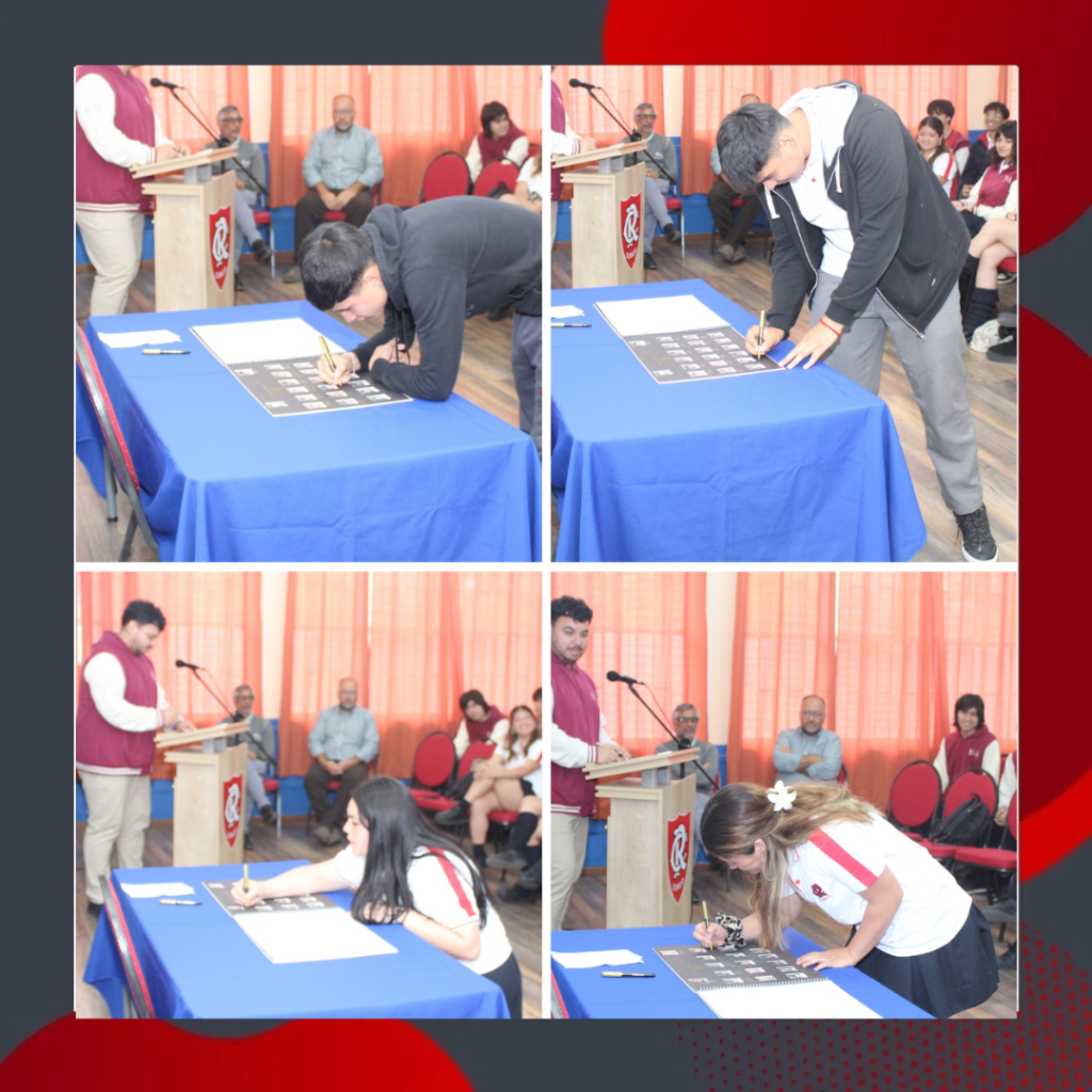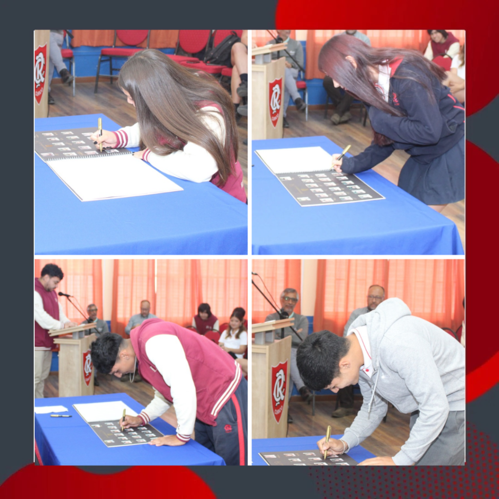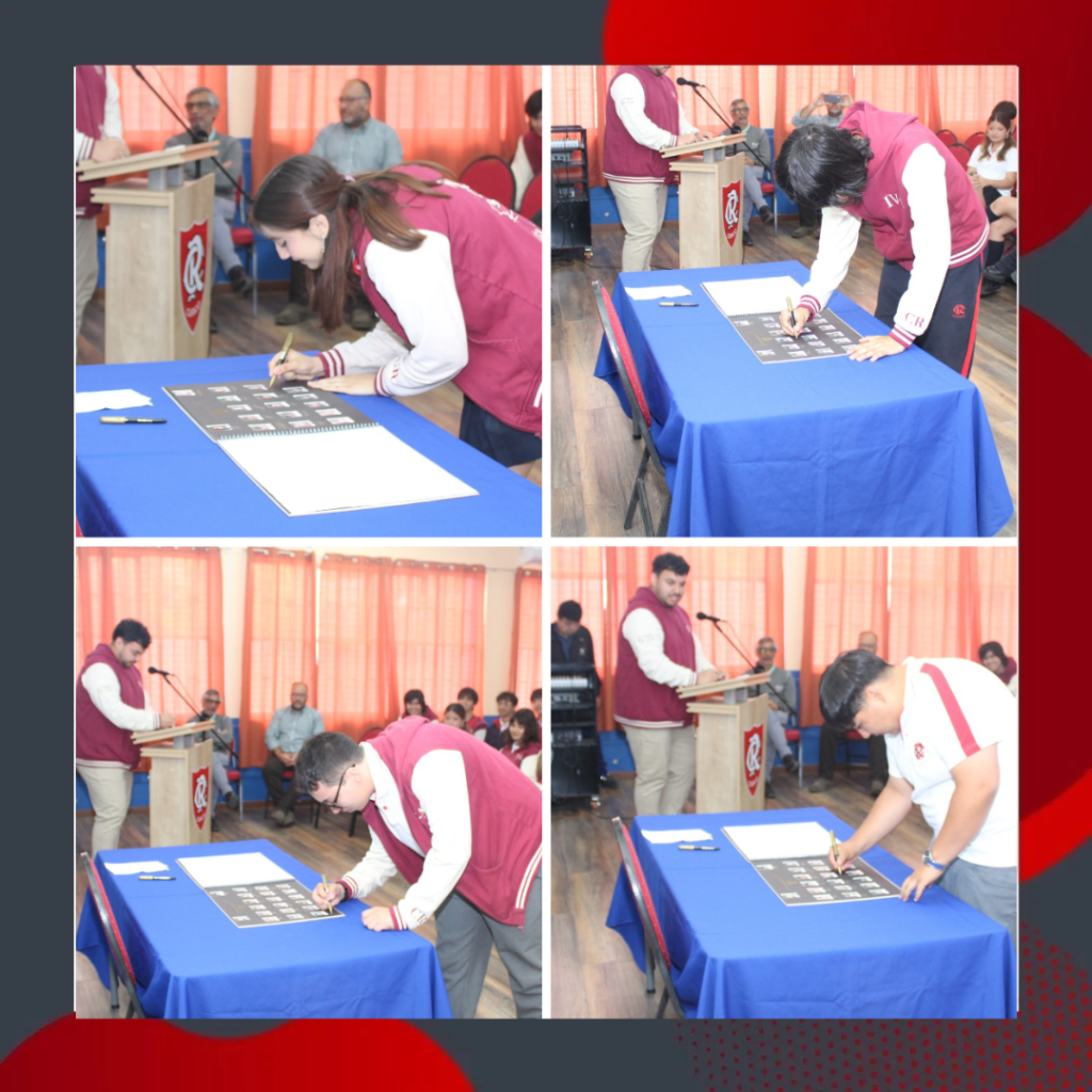 En la mañana de hoy, nuestros estudiantes participaron de una emotiva ceremonia, en la que, por última vez, dijeron presente cuando el profesor Franco Monsalve los nombró al pasar la lista, y fueron avanzando hacia adelante para cumplir con la tradición de firmar el libro de ex alumnos, que quedará como uno de los recuerdos de su paso por el colegio.