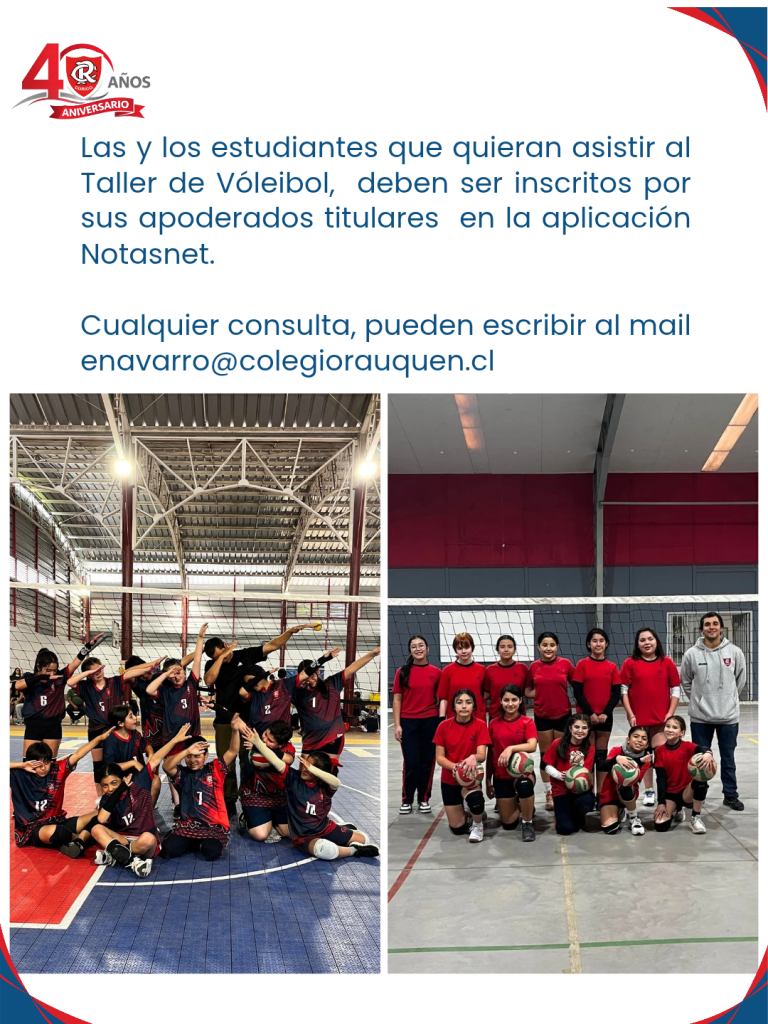 Cualquier consulta, pueden escribir a nuestro coordinador de talleres, el profesor Erick Navarro enavarro@colegiorauquen.cl
