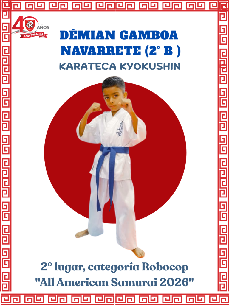 Démian Gamboa Navarrete tiene 8 años, es alumno de 2°  Básico B y practica Karate Kyokushin en “Daruma Dojo “. Hace unos días consiguió el 2° lugar en la categoría “Robocop”, en el torneo “All American Samurai Cup”, organizado por el “Team Daruma Chile”.