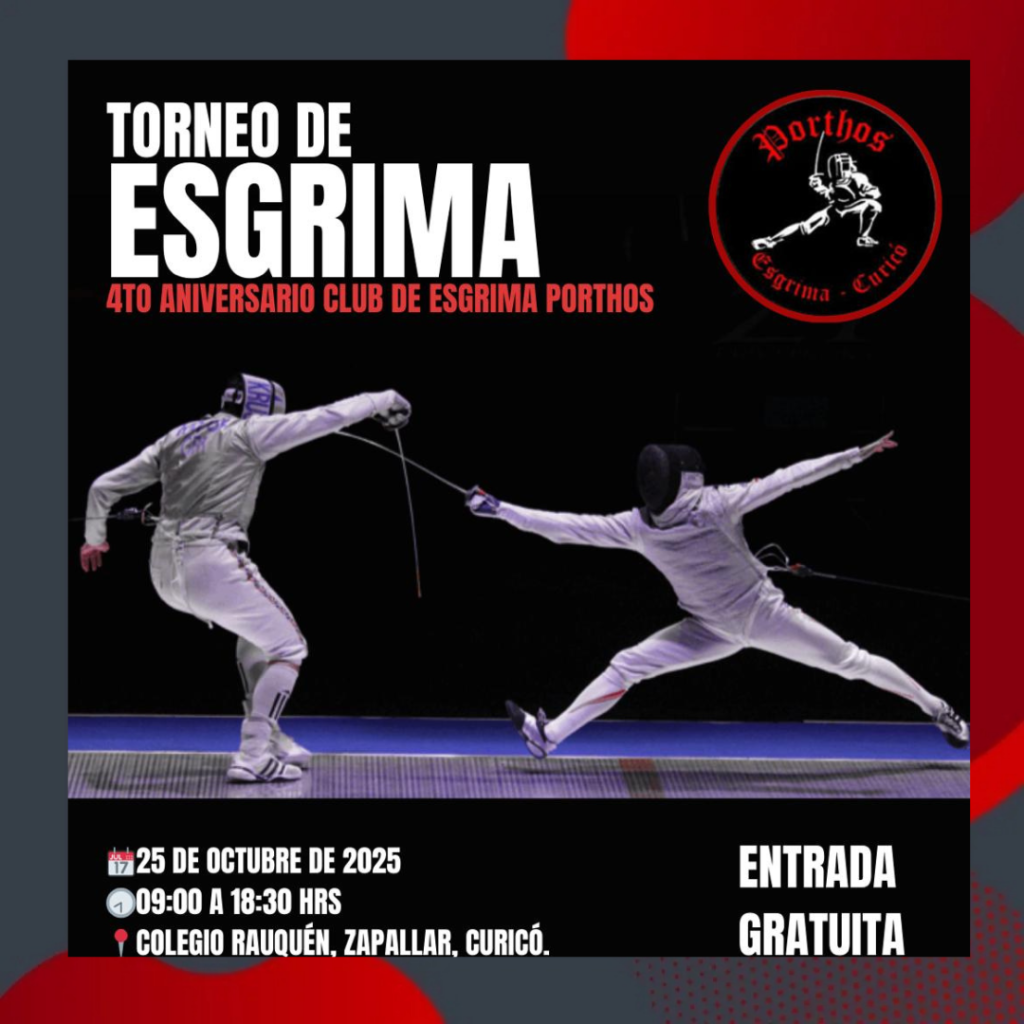 El sábado 25 de octubre en el local Zapallar, a partir de las 09.00 horas, todos los integrantes de nuestra Comunidad Educativa están invitados a asistir a un torneo de Esgrima, que se realizará con motivo del 4° aniversario del Club Porthos, en el que participan alumnos del Colegio Rauquén, que han conseguido importantes logros a nivel nacional e internacional.