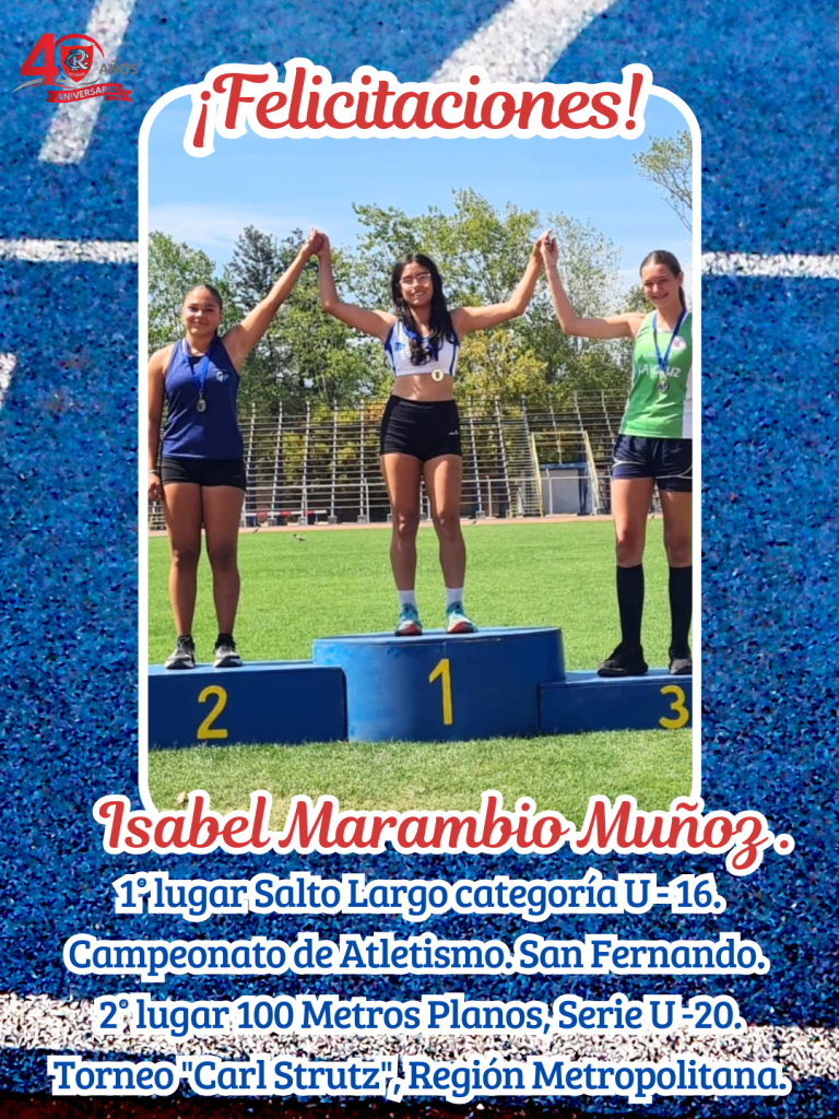 Las estudiantes Isabel Marambio Muñoz (8°A) y Charlotte Maire Arias (8°C), tuvieron una destacada participación en un campeonato atlético, organizado por el Club de Atletismo de Nancagua y que se desarroĺló en San Fernando. Ambas alumnas compitieron con deportistas mayores que ellas, de la categoría U – 16, por lo que sus resultados aun son más meritorios.